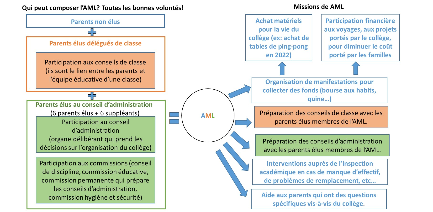 L’AML fédère donc toutes les bonnes volontés prêtes à s’investir pour une ou plusieurs missions. Elle permet de donner de la cohérence dans la participation aux instances du collège, et d’apporter un soutien aux parents ou au collège, à travers les différentes manifestations organisées. Il est bien sûr nécessaire de préciser que les actions engagées par l’AML sont destinées à tous les enfants de l’école sans distinction, conformément au principe laïque.